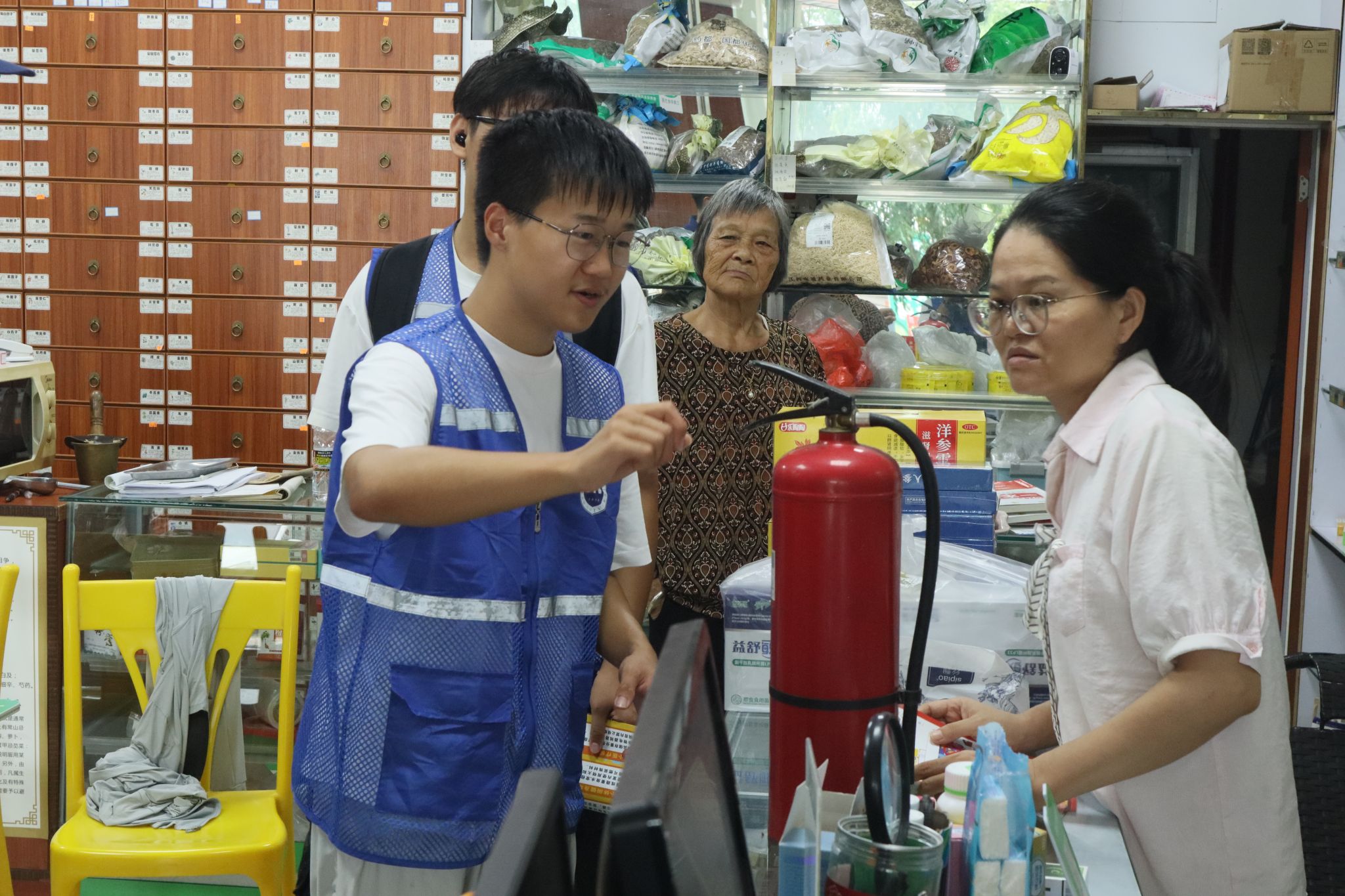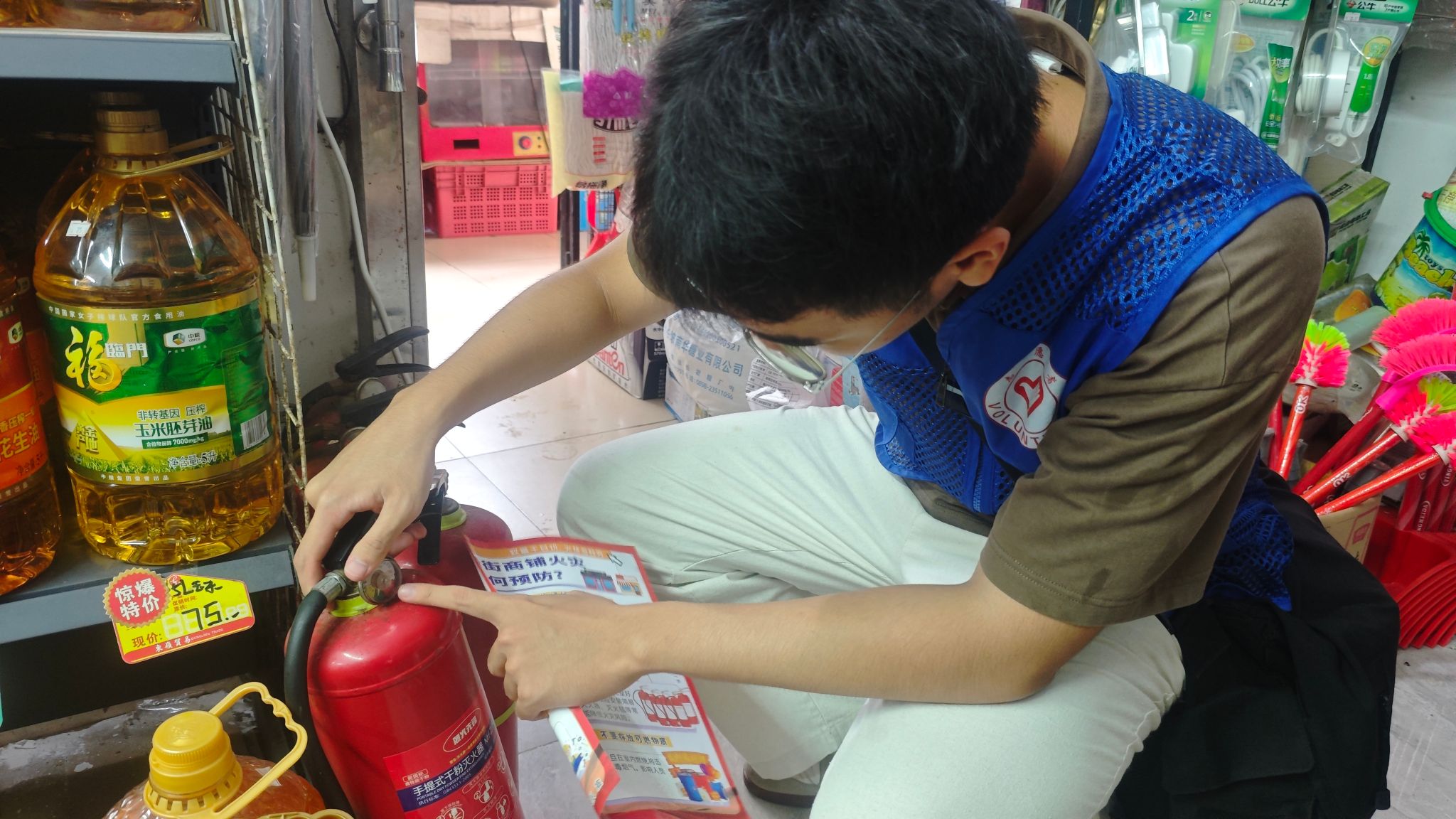 培训结束后,同学们分组向社区居民发放消防安全知识宣传单,现场排查商店内部消防隐患,以通俗易懂、生动形象的语言,向居民讲解火灾预防要点和演示灭火器正确使用方法。