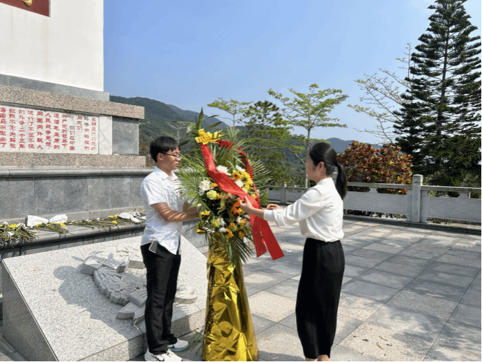 李洋代表书院党委向革命英烈敬献花篮,整理花篮缎带。全体同志依次敬献鲜花,缓步绕行,瞻仰革命烈士纪念碑,向革命烈士致敬,缅怀他们的丰功伟绩。