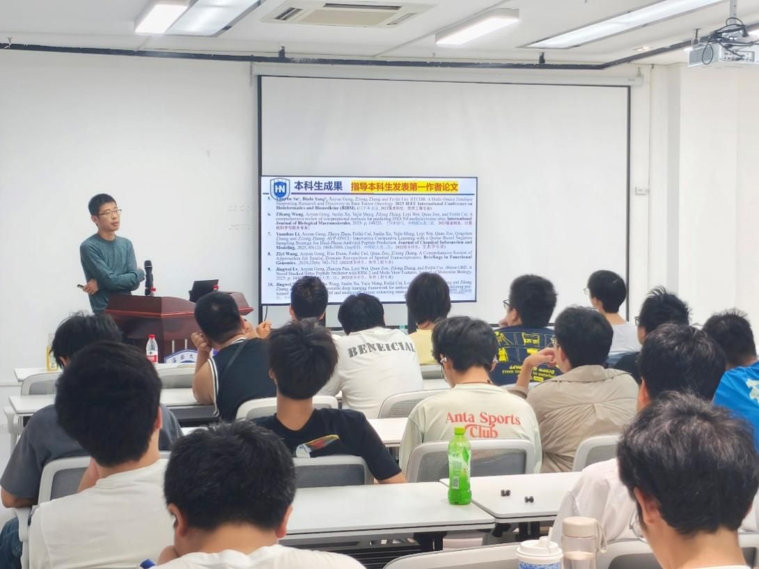 张子龙聚焦人工智能在生物学、医学、药学中交叉前沿和热点问题,介绍了当前研究方向和本课题组已取得成果,引导学生明确自己的学习目标。