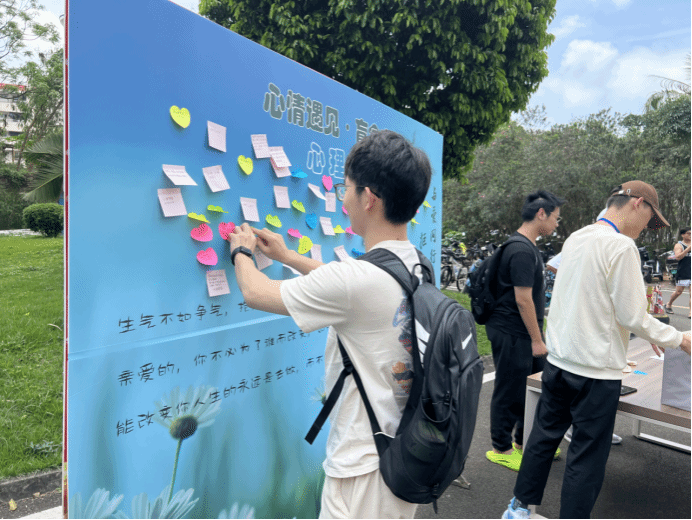 活动现场,有些同学将自己的心情、困扰、祝福等写在便利贴、粘在展板上;还有些同学从“能量”盲盒中抽取能量卡片,卡片上的话语或鼓励、或安慰、或理解,充满着温暖和力量。