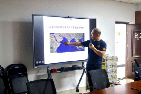 肜群旺作《为了祖国的利益护航——从亚丁湾索马里海域护航见闻说起》主题报告。他结合自身经历,从我国出兵索马里亚丁湾海域护航的原因及意义开始,讲到亚丁湾的地理位置和亚丁湾海盗的由来,最后谈到国防事业时,肜群旺希望同学们能够利用自己的专业知识,今后在不同岗位上为国防安全贡献力量。