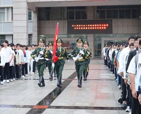 国旗护卫队队员目光如炬、步伐整齐,护送五星红旗入场。当国歌响起,鲜艳的五星红旗缓缓升起,迎风飘扬。全体师生肃然伫立,面向国旗行注目礼。