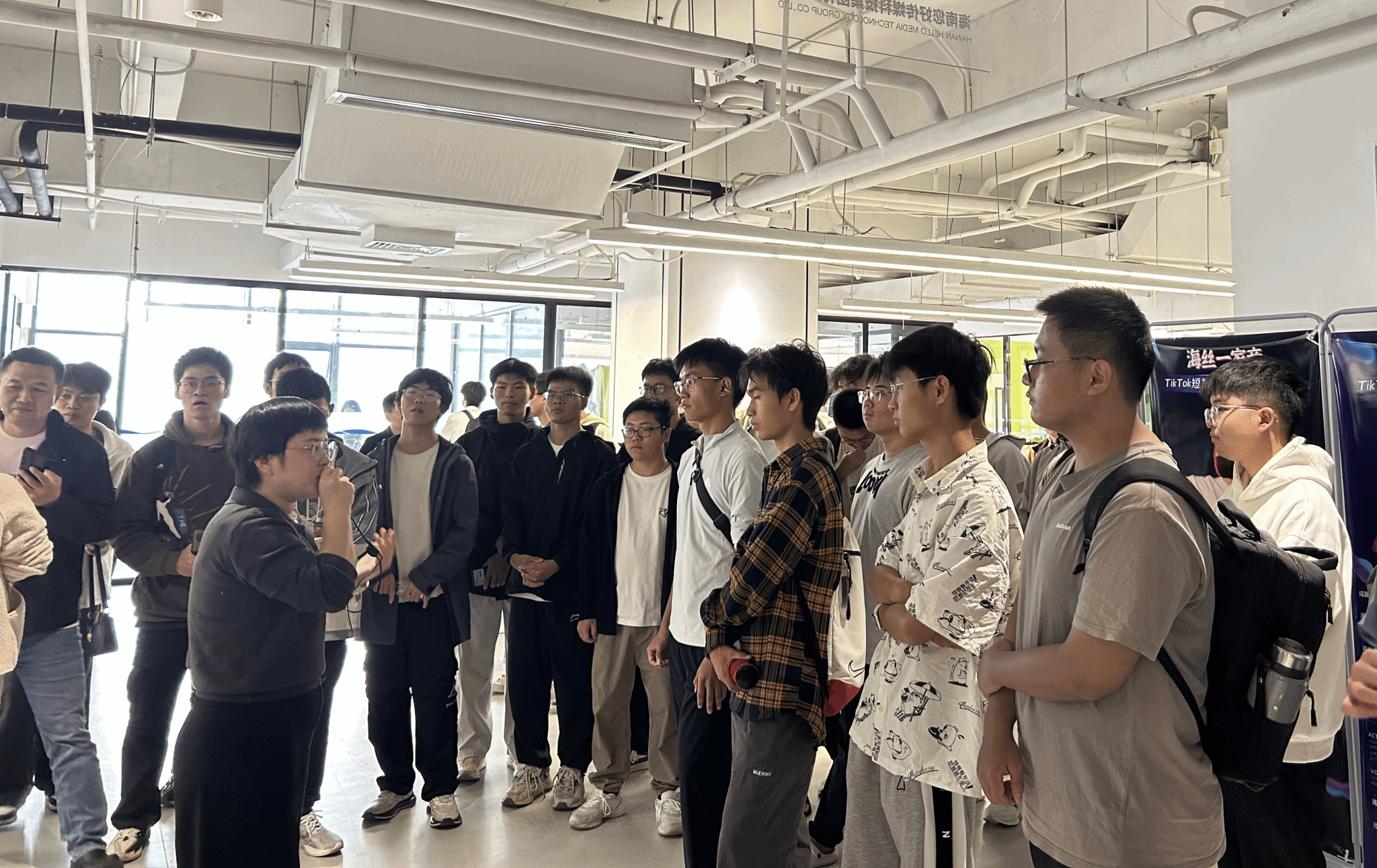 随后,同学们走进国际离岸创新大厦,实地了解入驻企业办公室区域和业务展区,近距离感受职场氛围。通过工作人员的详细讲解和互动问答,大家更加了解了企业的核心业务、企业文化、人才需求等。