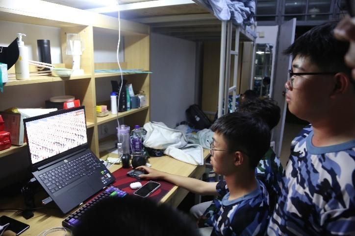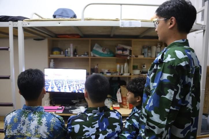 在宿舍里,同学们自发观看阅兵,激昂有力的口号声让同学们心情澎湃。