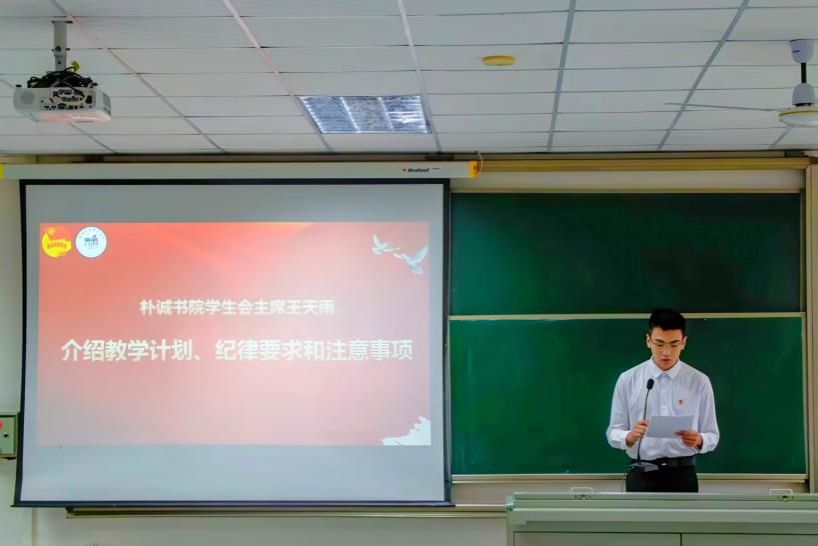 英国威廉希尔公司学生会主席团成员、拓新班班长王天雨介绍了教学计划、纪律要求和注意事项。本次训练营共18课时,由专题讲座、参观学习、素质拓展、交流研讨等环节组成。