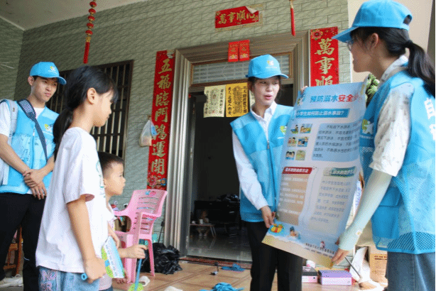 团队成员实地走访了海口市龙华区美仁坡村。美仁坡村紧邻南渡江,村里的许多家长特别邀请队员们入户为小朋友们详细讲解预防溺水知识。“看到小朋友们认真聆听的神态和纯真开朗的笑容,我深刻感受到了科普活动的意义!”队员刘航这样说道。科普结束后,队员们还和美仁坡村党总支书记吴挺鸿进行了座谈交流。吴挺鸿重点介绍了村里的荷花种植产业,也提出了当前限制该产业发展的因素,同时针对调研问题进行了耐心解答。