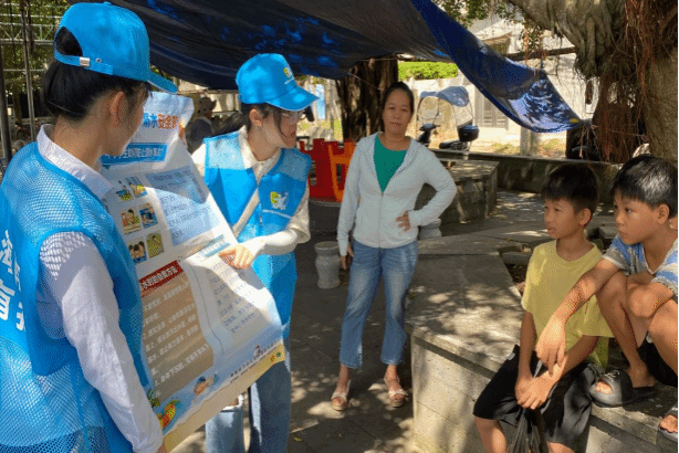 团队成员深入调研了海口市龙华区新坡村。首先,队员们和村委会工作人员座谈交流,了解到新坡村当前的产业发展现状、竞争优势和未来前景;随后,队员们走村入户,看望了村里的部分留守儿童和空巢老人,和他们交流互动的同时为他们讲解生活中的科普知识;紧接着,队员们在新坡村文化广场,围绕“垃圾分类”“预防溺水”“正确使用农药”等举行了小规模的科普宣讲活动,现场反响热烈。最后,队员们走进当地村民喜爱的老爸茶馆,别出心裁地开展了一场特色普法宣讲,从“解决土地纠纷”到“保障消费者合法权益”、从“农村土地流转”到“预防网络诈骗”等,大家听得津津有味,还提出疑问和困惑,这样轻松、亲切、亲近的讲解方式深受村民们好评。