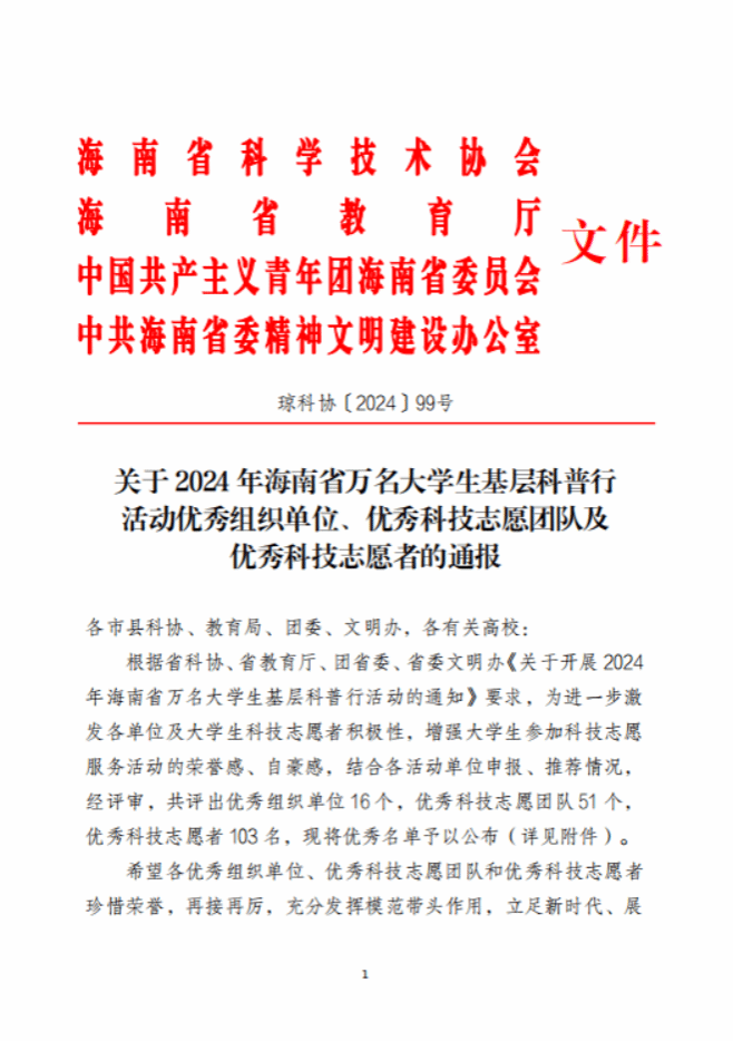 为进一步激发各单位及大学生科技志愿者积极性,增强大学生参加科技志愿服务活动的荣誉感、自豪感,近日,省科协、省教育厅、团省委、省委文明办对在2024年海南省万名大学生基层科普行活动中表现突出的单位、团队和个人进行通报表扬。