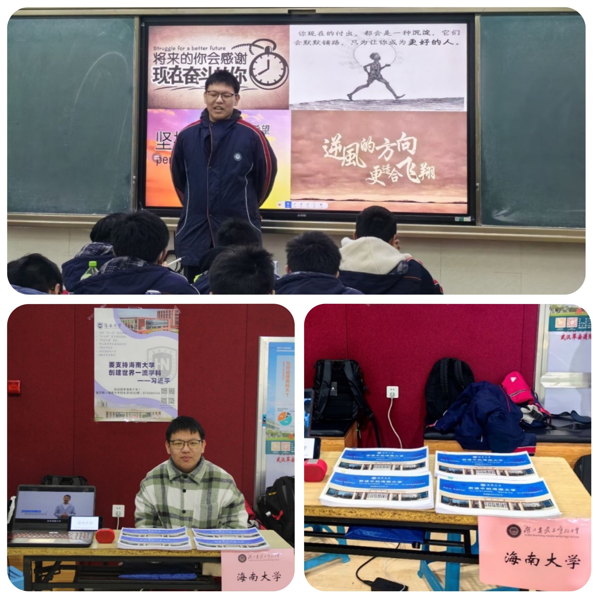 2024年1月24日,我回到了高中母校湖北省武昌实验中学开展招生宣讲活动。我根据海南大学发放的招生宣传材料,制作了图片宣传册、打印了招生宣传海报、建立了咨询交流QQ群,并在高中团委老师的带领下,精心布置了海南大学招生宣传点,还电脑同步播放招生宣传片。