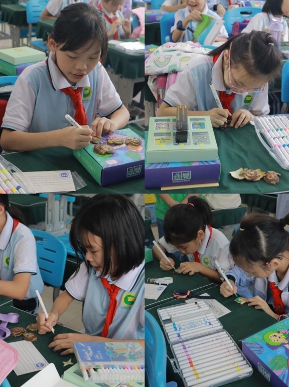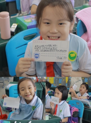 小朋友们为了向志愿者以及“椰城印迹”团队的哥哥姐姐们表示感谢,亲手在卡片上写下了他们想说的话,谢谢他们对活动的耐心指导和帮助,期待并欢迎他们下次再来。志愿者和“椰城印迹”团队的队员们不仅教会了大家如何使用颜料和画笔,还鼓励他们充分发挥想象力,将创作与个人兴趣和日常生活相结合,画出独特的椰雕作品。
