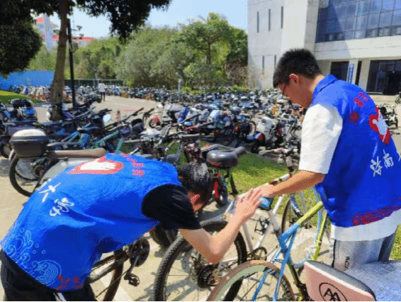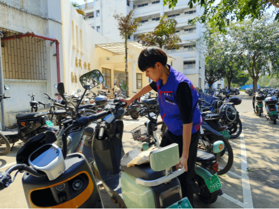 志愿者们利用午饭和晚饭时间,在学生社区规范引导车辆停放、查看电动车充电情况、排查安全隐患、文明劝导大家安全骑行等,用实际行动践行雷锋精神