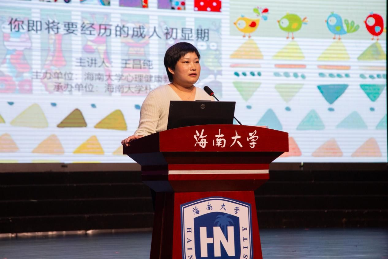 心理健康教育中心副主任王昌纯应邀作题为《你即将要经历的成人初显期》的心理健康教育报告。她从大一新生可能遇到的心理问题入手,围绕“入学适应期”“成人初显期”“零糖社交”“专业支持”四个部分,向同学们阐述了大学生的心理特点以及如何保持心理健康。
