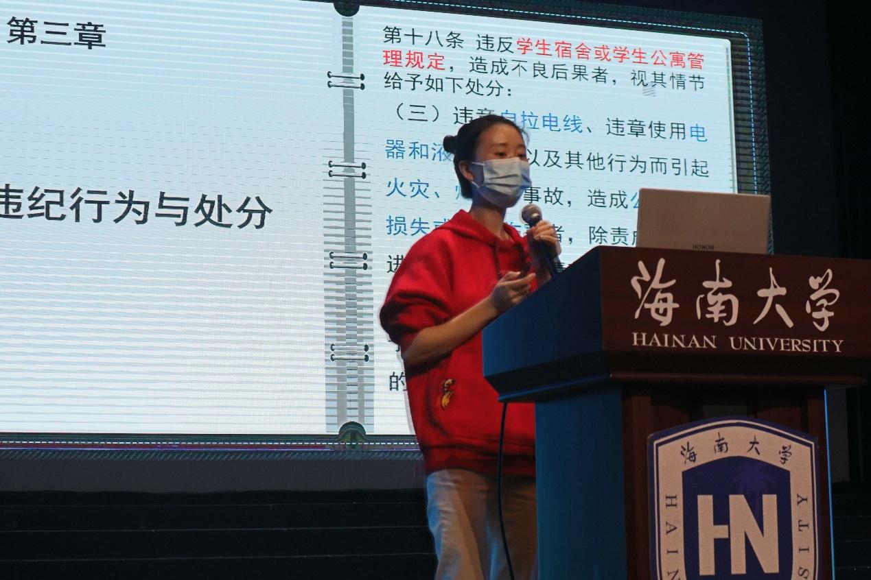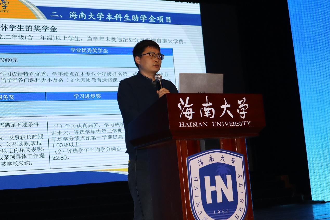 会上,新生辅导员宋海婷、张红运、王杜娟三位老师分别为同学们开展了安全教育、学校奖助体系介绍和纪律教育。宋海婷从反诈防盗、交通安全、禁毒防艾、消防安全、预防溺水、反套代购等方面,结合生动案例,对同学们进行了安全叮嘱。张红运详细介绍了海南大学的奖学金、助学金体系以及各项要求,帮助同学们树立目标,充分准备。“没有规矩,不成方圆”,王杜娟重点从考试纪律、课堂纪律、请假规定、宿舍管理规定等方面讲解了学校相关处分规定,提醒同学们自觉做一名遵规守纪的学生。