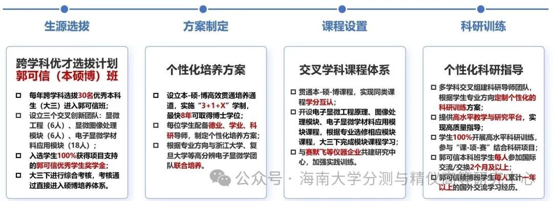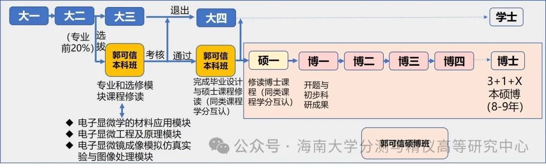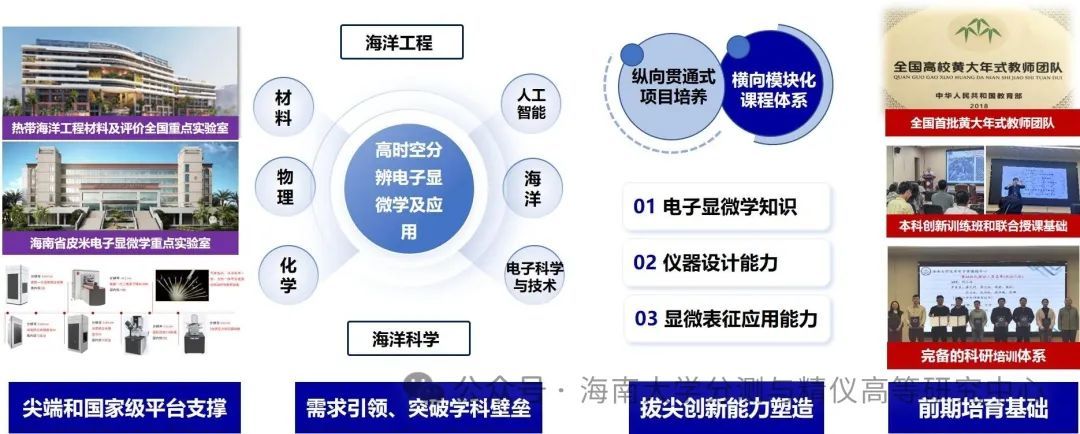海南大学为全面系统深入推进“三大改革”,实施“一流学科突破计划”,一体设计和推进科技创新、人才培养和学科建设发展。海南大学“一流学科突破计划”全校立项7个A类项目,高时空分辨电子显微学作为其中的A类标杆项目,推出“郭可信本硕博班”作为拔尖创新人才培养基地,由陈江华教授领衔,依托国际顶尖电镜平台——皮米电子显微镜中心。