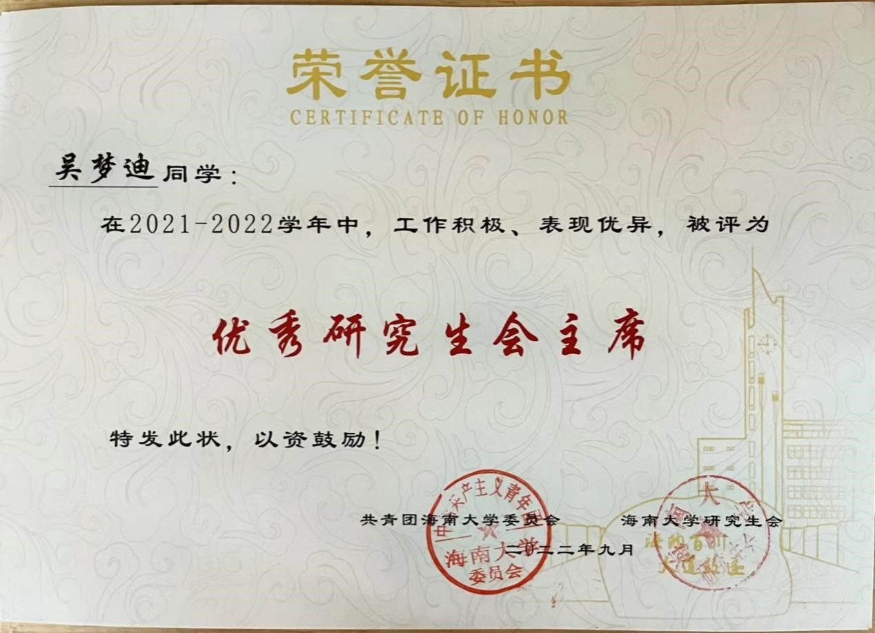 她还积极参与“全国高校百个研究生样板”的建设工作。担任党支部副书记期间,不仅认真细致完成各项任务,还发挥个人所长,重点参与党支部微信公众号建设,共计推送34期微信推文、制作10期“党史学习教育”宣传视频。与此同时,在担任外国语学院研究生会执行主席期间,她积极配合指导老师组织开展“研代会”“团代会”“体育文化节”等重大活动,受到老师和同学们的一致好评,还获得海南大学“优秀团属融媒体工作者”。