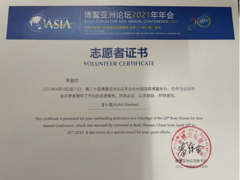与此同时,她积极参与许多校园文化活动和志愿服务活动,如“第十四届话剧大赛”“2021博鳌亚洲论坛”“红船大合唱”“体育文化节”“微夜跑”“清明祭拜活动”等,尤其是她主要参与录制的自贸港宣传视频“小苑讲英语”(抖音),获赞1341、粉丝关注量2658。