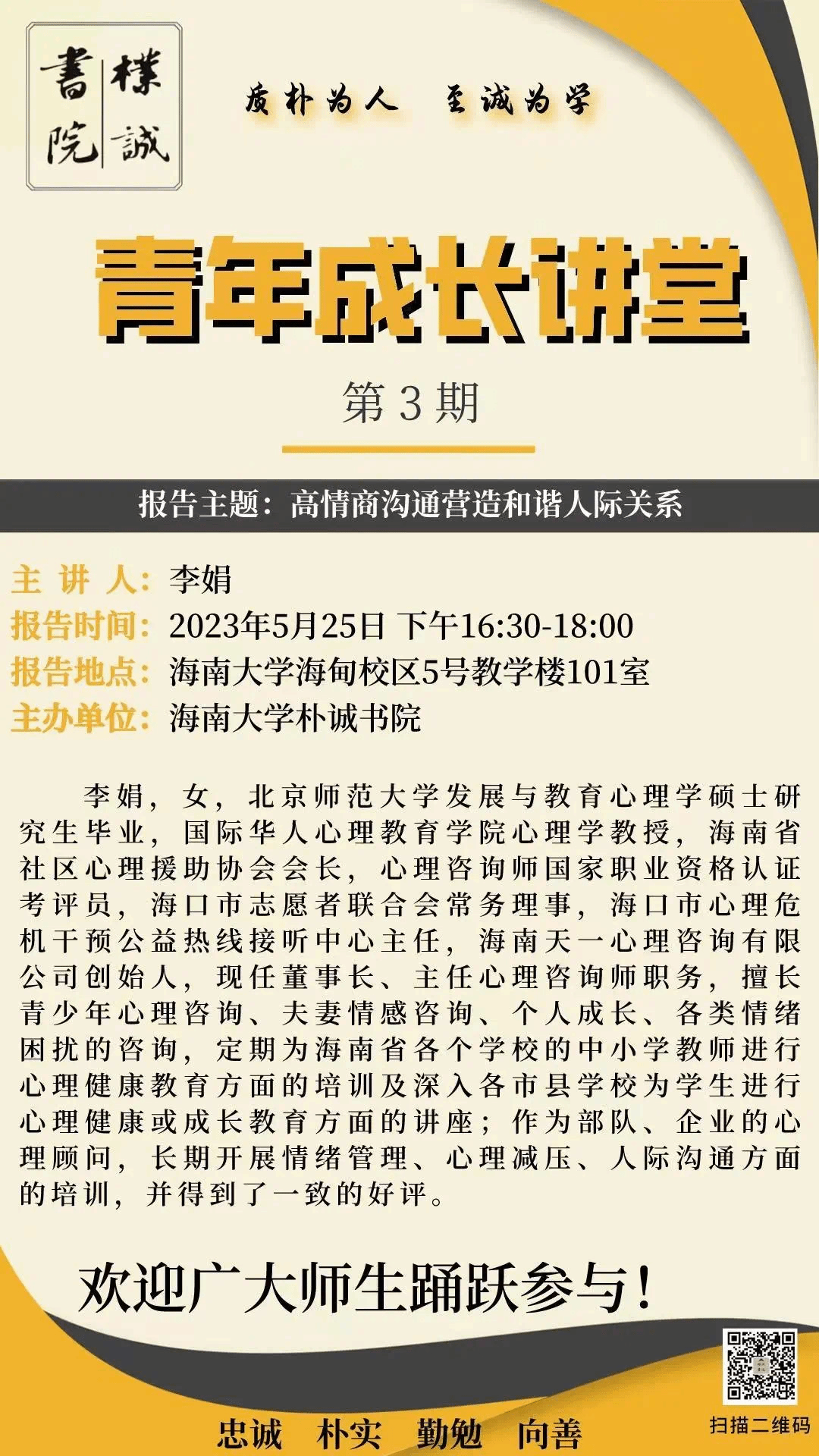 海南大学英国威廉希尔公司将于5月25日在5号教学楼101室举办第三期“青年成长讲堂”,欢迎大家积极参与。