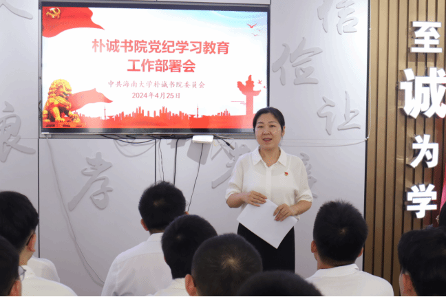 李洋作动员讲话。她要求,书院各级党组织和全体师生党员要提高政治站位,深刻理解、充分认识开展党纪学习教育的重要意义;要端正学习态度,坚持原原本本学、联系实际学,力戒形式主义,真正做到学习入脑入心;要将遵规守纪内化于心、外化于行,带头执行好党的纪律,切实推动党纪学习教育见实效。
